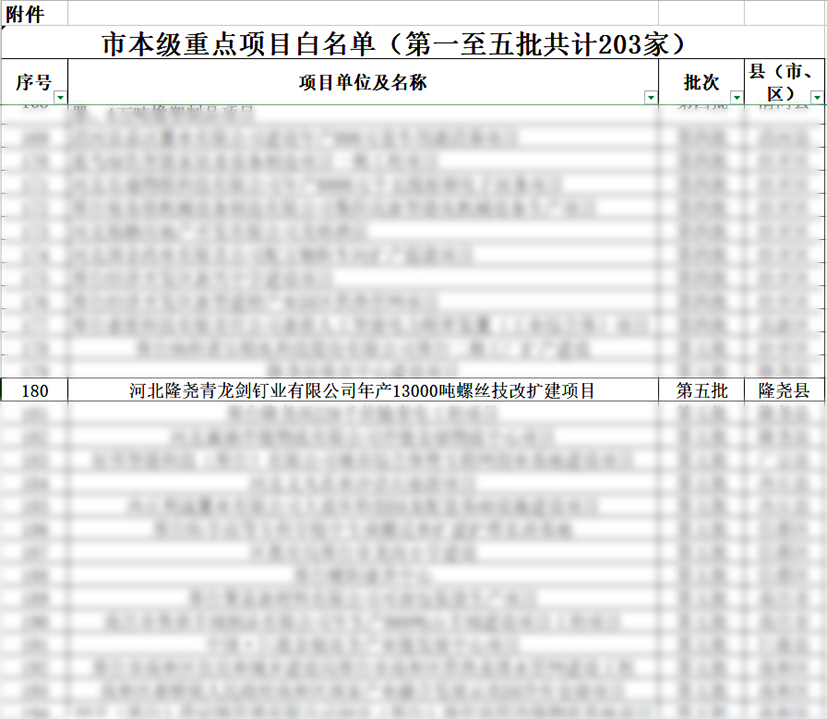 日前,邢臺市生態(tài)環(huán)境局網站公布了《邢臺市本級重點項目白名單企業(yè)》,青龍劍釘業(yè)作為“重點優(yōu)質制造業(yè)”,《河北省重點產業(yè)鏈供應鏈企業(yè)白名單》入選、22年動態(tài)調整列入《邢臺市生態(tài)環(huán)境監(jiān)管白名單企業(yè)》后,2023年第三次動態(tài)調整再次上榜!