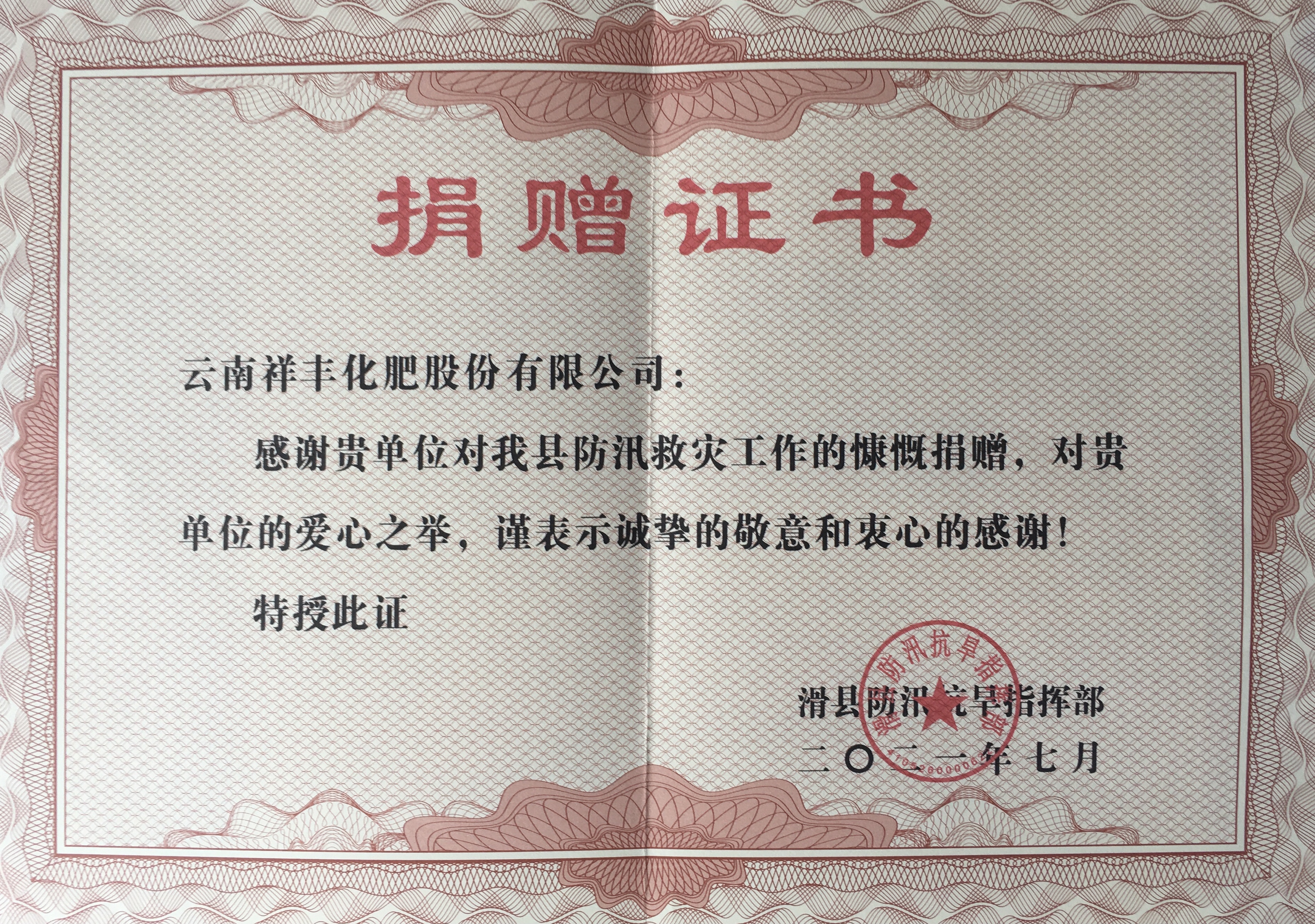 (滑縣)防汛救災(zāi)復(fù)合肥捐贈(zèng)證書