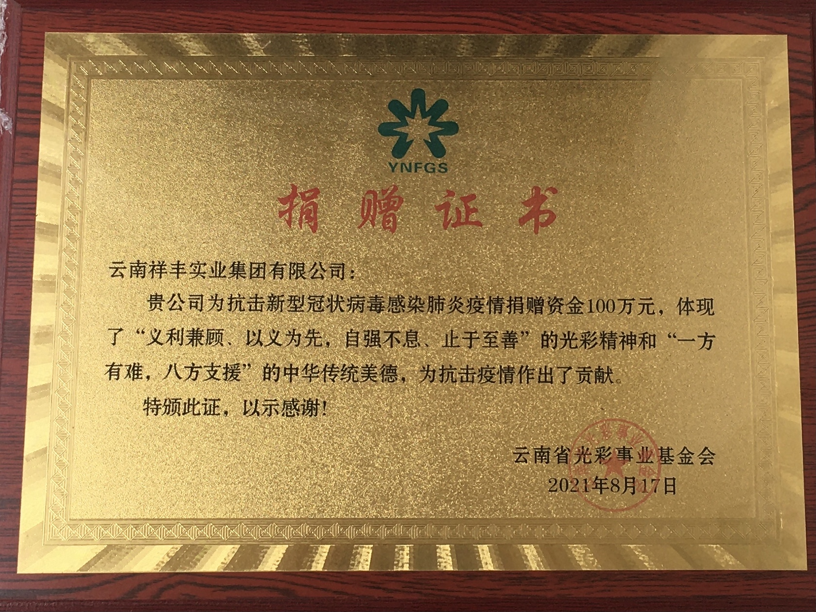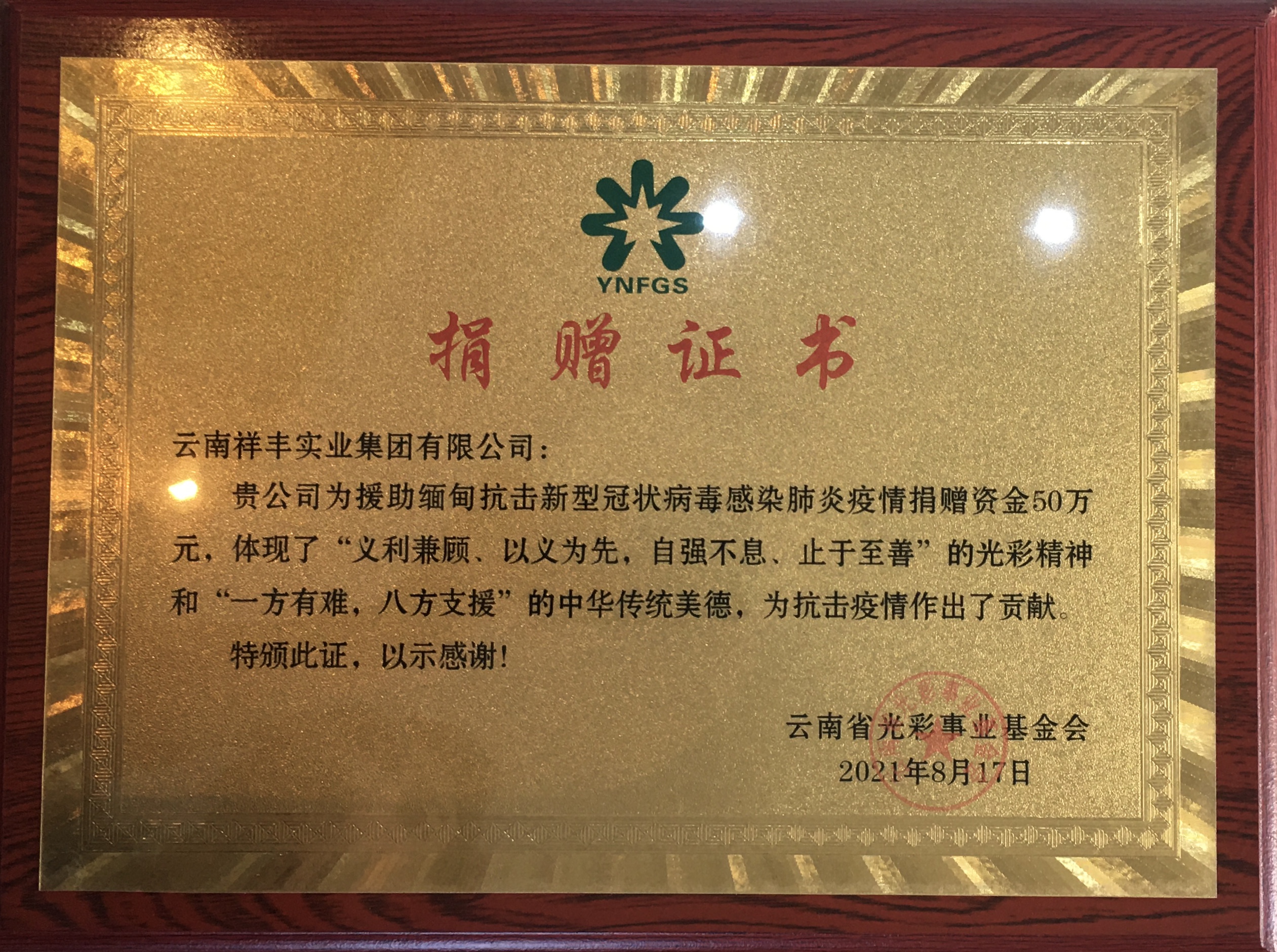 2021援緬抗疫捐贈(zèng)50萬(wàn)證書