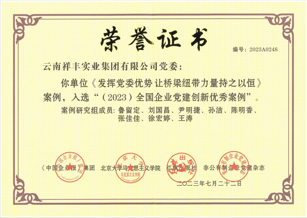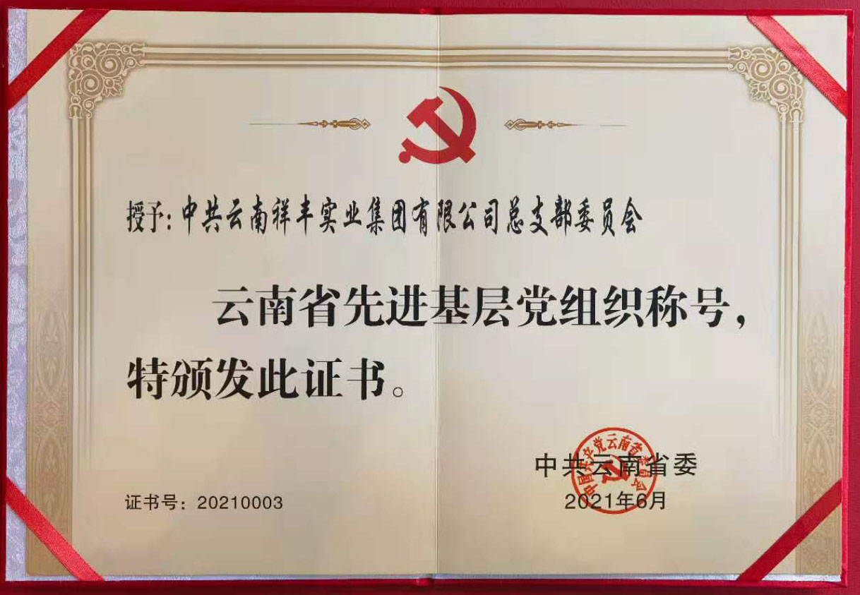 2013年7月,祥豐黨支部2011—2012年度"云嶺先鋒"工程被中共連然街道工作委員會(huì)評為"先進(jìn)基層黨組織";2013年7月,祥豐黨支部被中共安寧市委評為"基層黨建示范點(diǎn)";2013年7月,公司團(tuán)工會(huì)楊洪銘被推薦為"安寧市青年聯(lián)合會(huì)第二屆委員會(huì)委員";2013年7月,公司團(tuán)工委組織公司全體職工團(tuán)員青年開展"愛心水窖"捐款活動(dòng),祥豐集團(tuán)